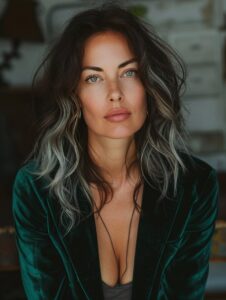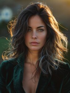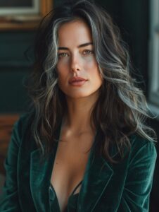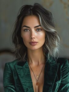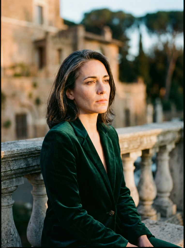 portrait of elegant woman, 35 years old, dark hair with silver streaks, emerald velvet blazer, golden hour lighting, shallow depth of field, cinematic film grain, contemplative mood --ar 3:4 --style raw --v 6